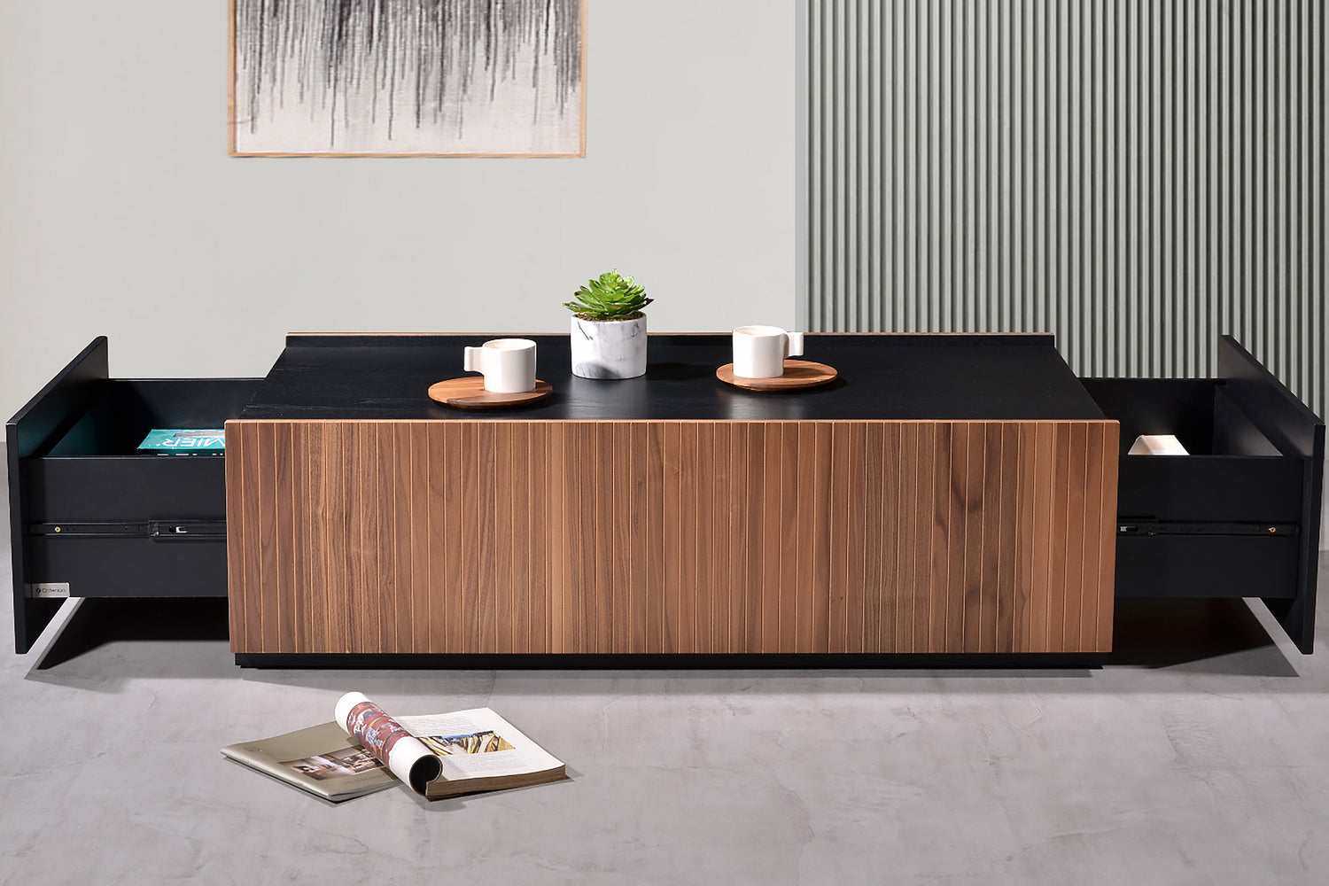 Each piece in the Coogee Range is finished in Natural and Ash Wood Veneers. Each piece has a focus on the dark ash wood veneer with the fronts and sides of the furniture pieces finished with the contrasting Natural Walnut Wood Veneer. The style is simply eye-catching.