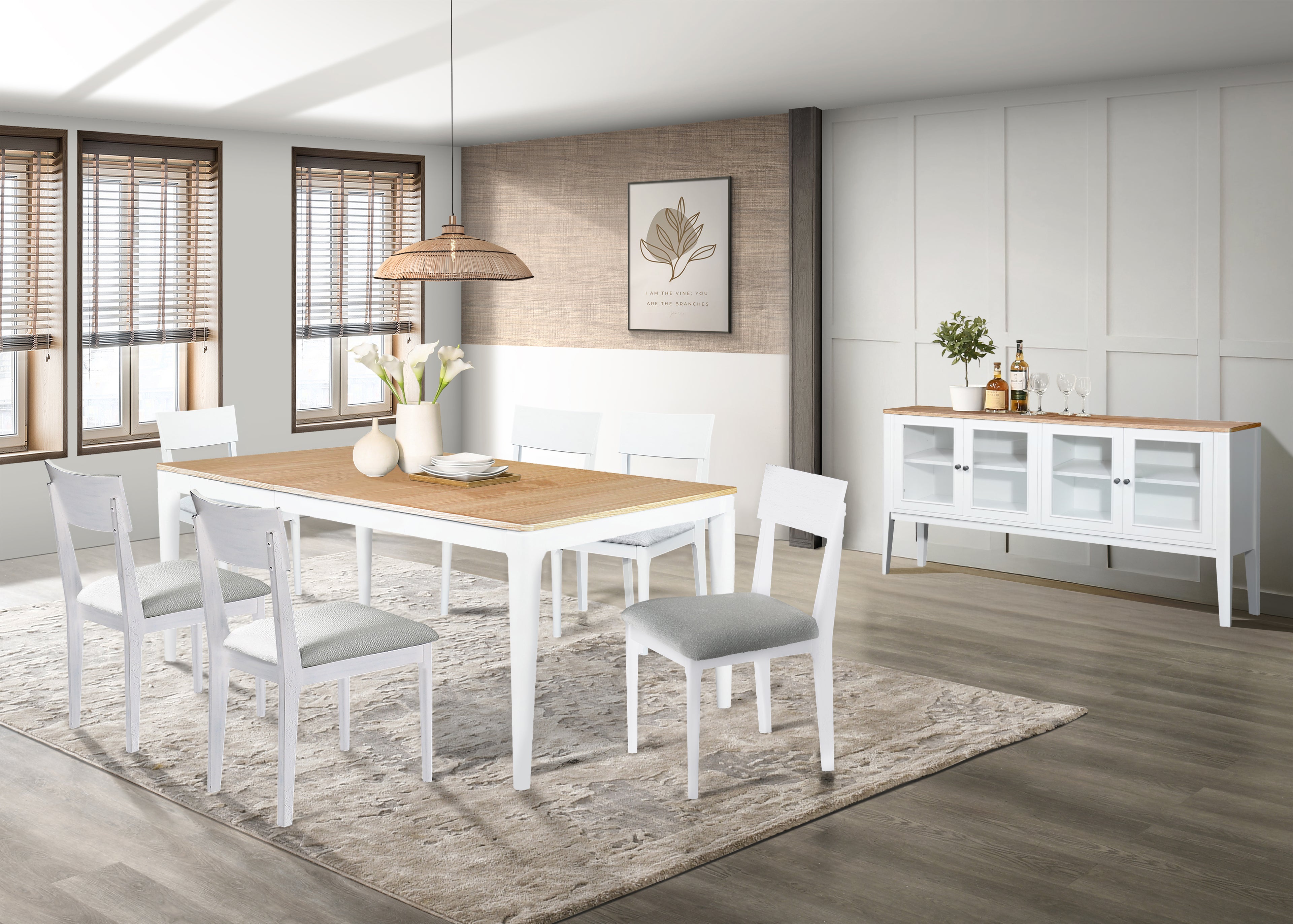 Painted White Oak Veneer, Natural Top Finishes and Solid Hevea Wood Legs.
