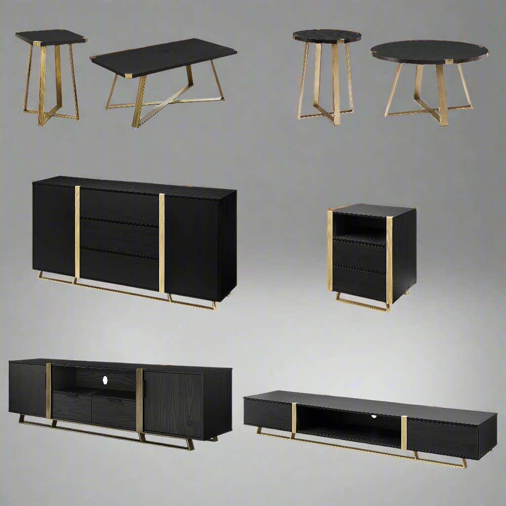 The Capri Black Oak and Distressed Gold Range consists of, two different style Coffee Tables, two different style Side Tables, two different style TV Units, a Buffet and a Bed Side table. A look and style to suit all needs.