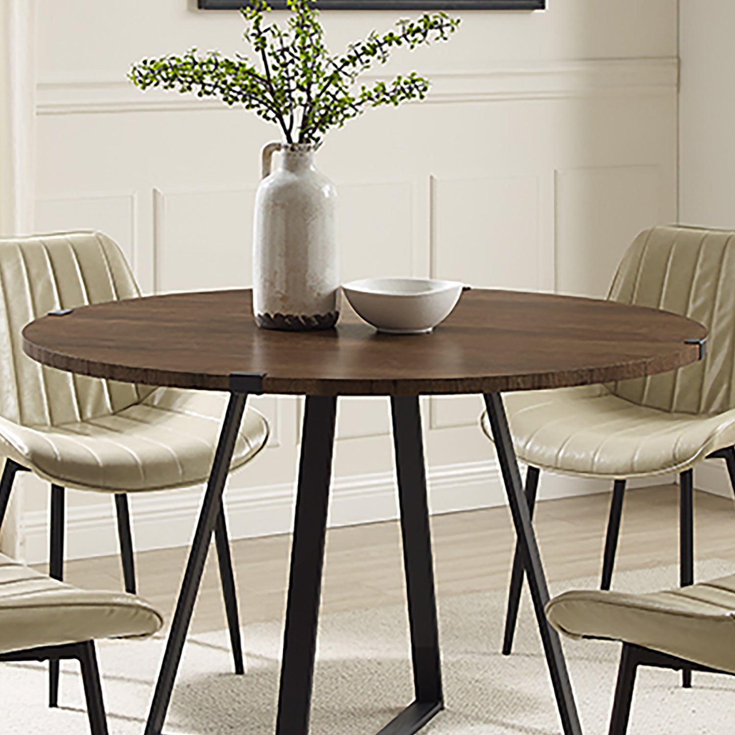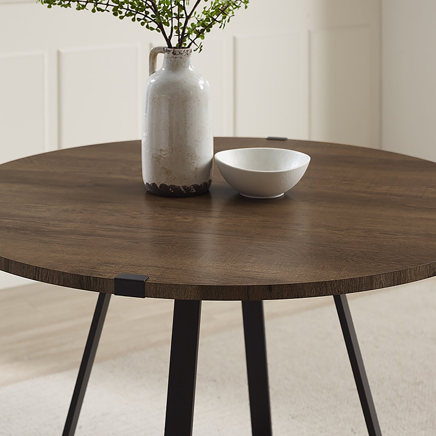 Criterion Capri Dining Table 1150mm Round Table, Black Metal Leg and Metal Highlights Dark Oak