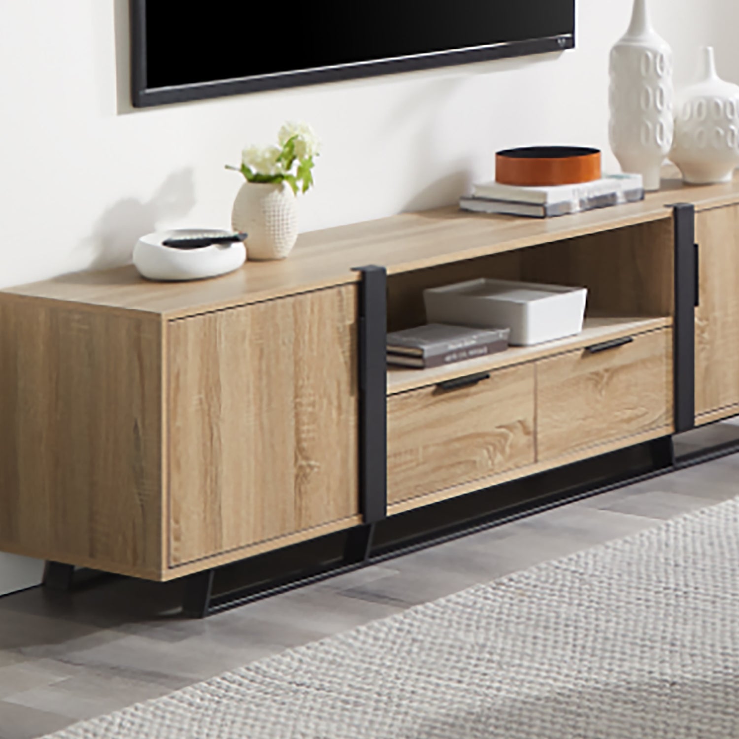 The Criterion Capri Entertainment Center is a stylish and functional piece of furniture. Offering one component space or sound bar space, cable management, two drawer fronts with metal handles, and ball bearing drawer runners, it makes managing and storing your entertainment accessories simple and hassle-free. With its oak cabinet, black metal frame and highlight panels, it brings a luxurious touch to any living or entertainment area.