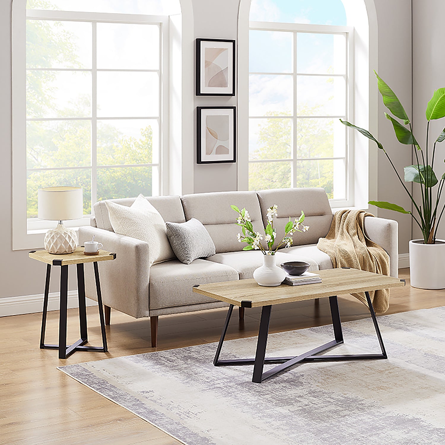 This Criterion Capri End Table is a sophisticated, modern statement piece for any living space. The square table top is supported by a black metal leg frame, and features metal edge highlights for an elegant touch. Finished in oak, it's a timeless, classic design that is sure to last. Enjoy peace of mind with a 12 month warranty.