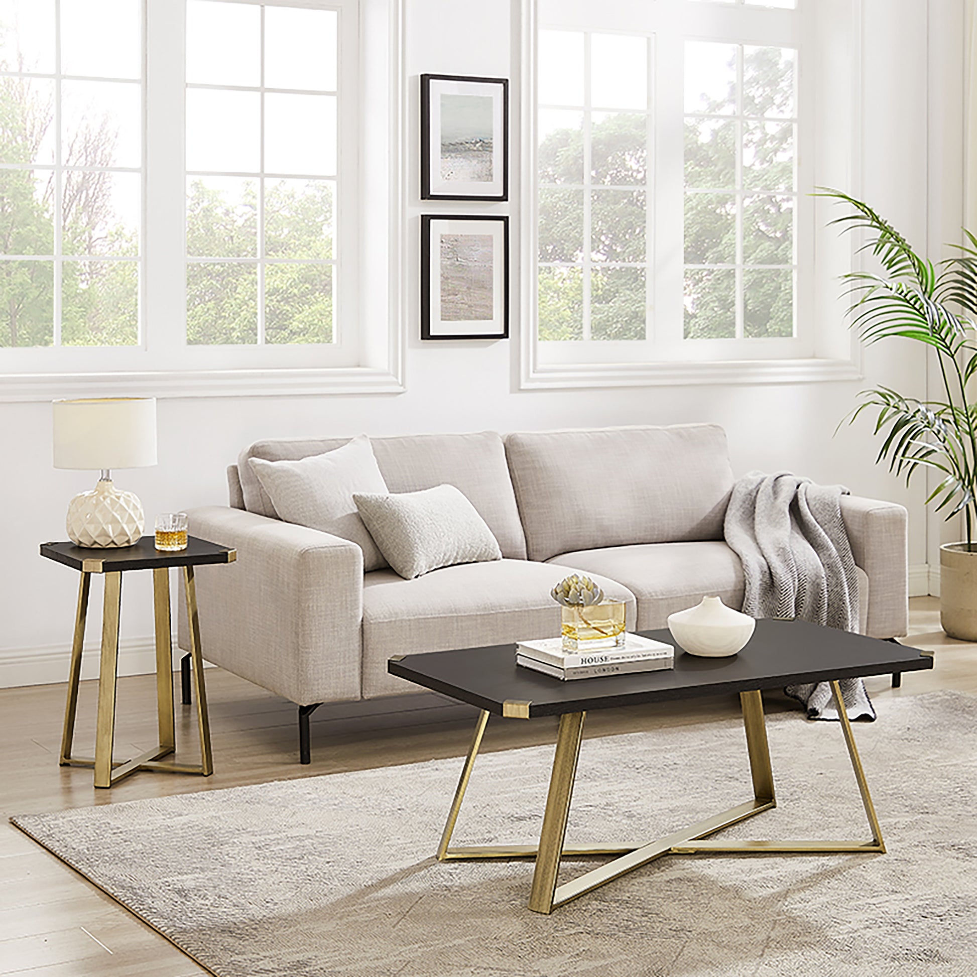 This Criterion Capri End Table is a sophisticated, modern statement piece for any living space. The square table top is supported by a gold metal leg frame, and features metal edge highlights for an elegant touch. Finished in black oak, it's a timeless, classic design that is sure to last. Enjoy peace of mind with a 12 month warranty.