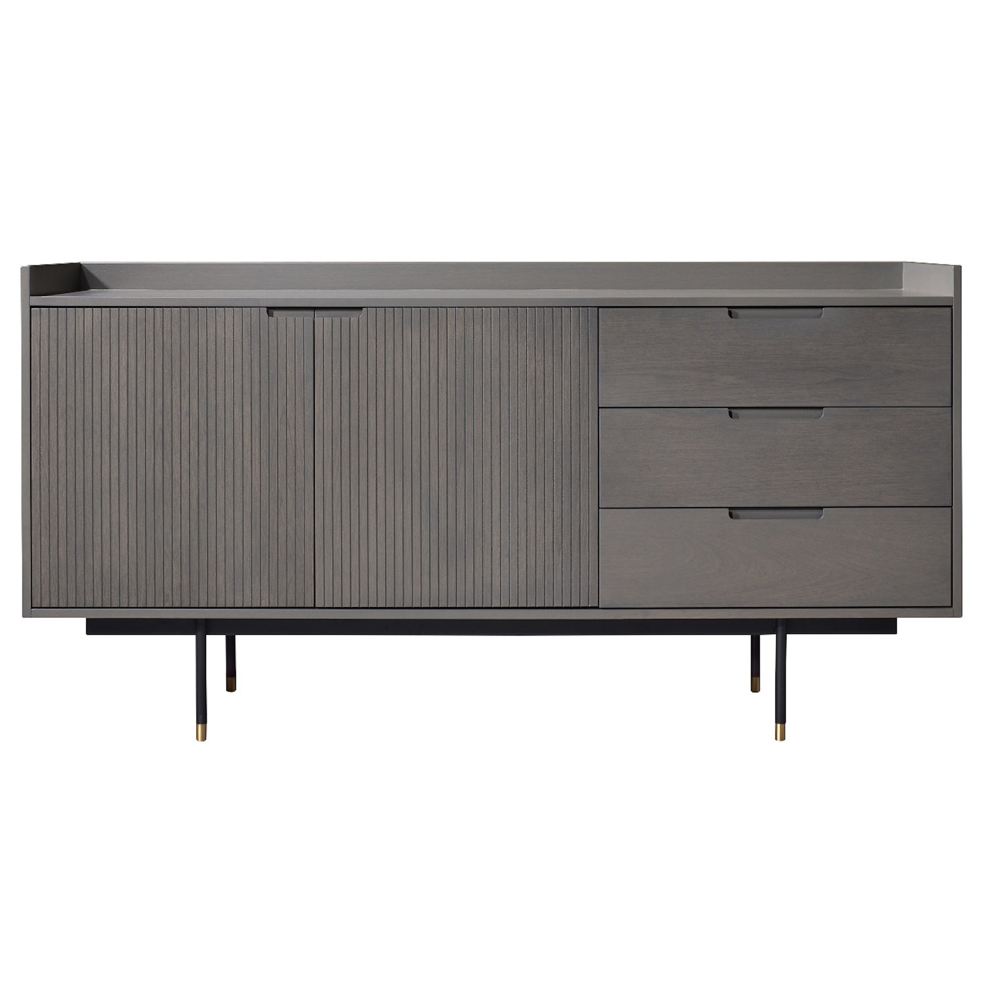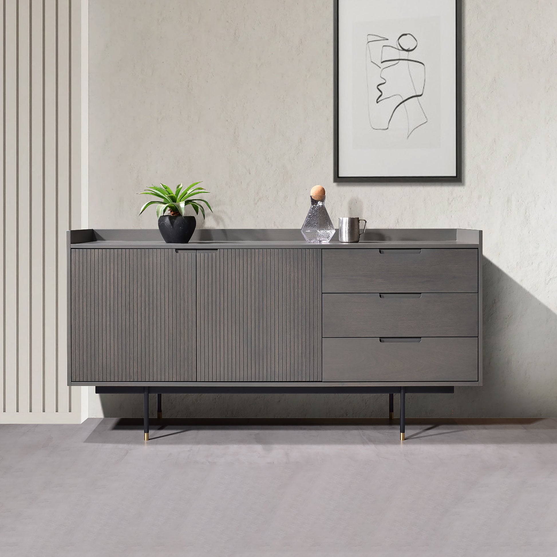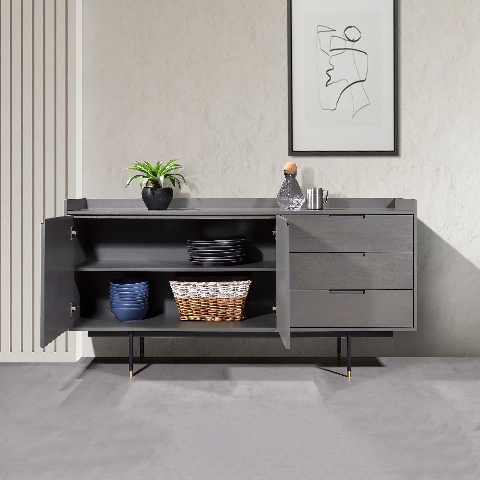 The Criterion Bremer Buffet offers a sleek, stylish storage solution with three drawers and two doors. Finished with a grey KSK wood veneer, powder-coated steel legs, and bronze tips, this quality buffet is built for longevity and sure to last with its 12 month warranty. Enjoy the large table top space for all your decorative pieces and convenience with its semi-assembled design.