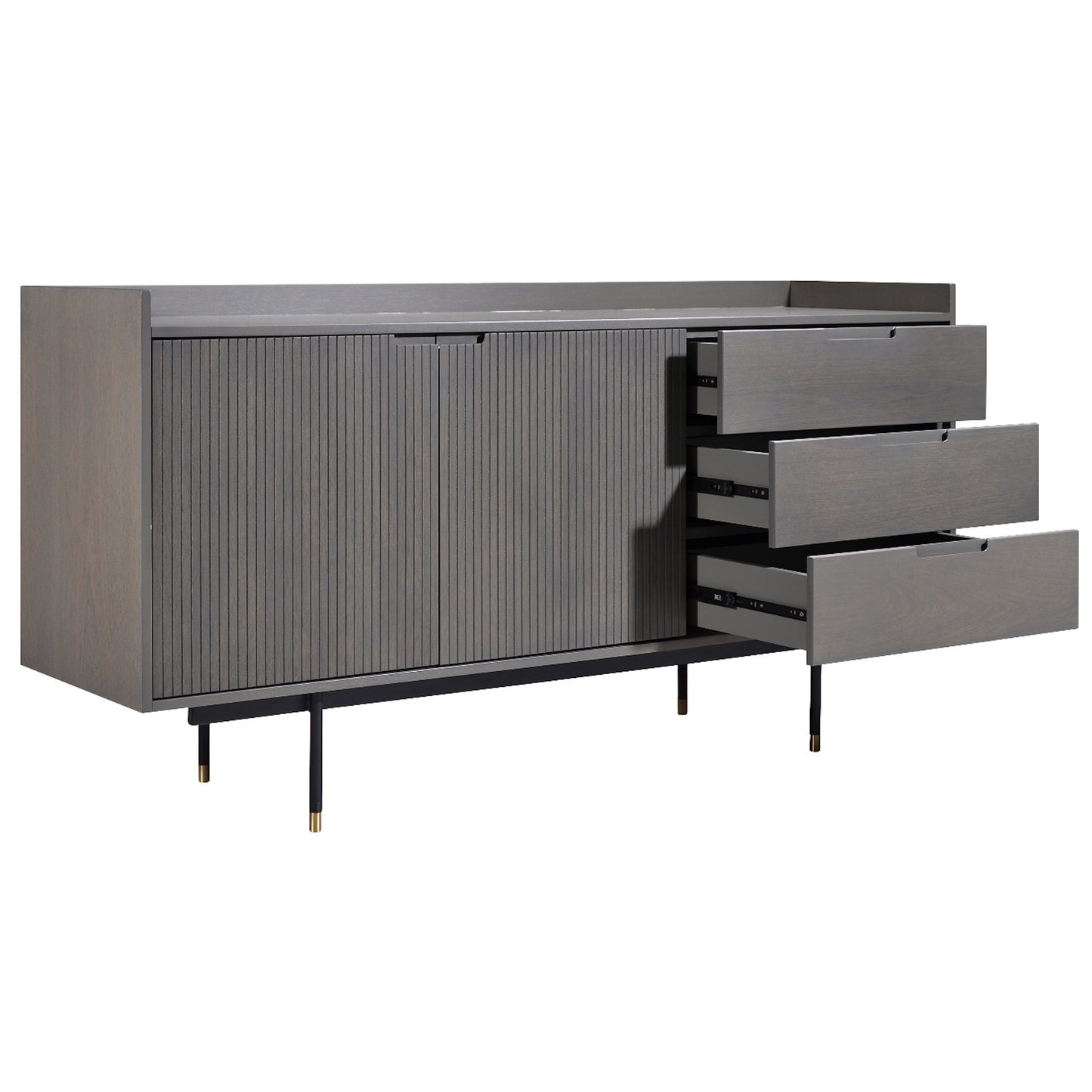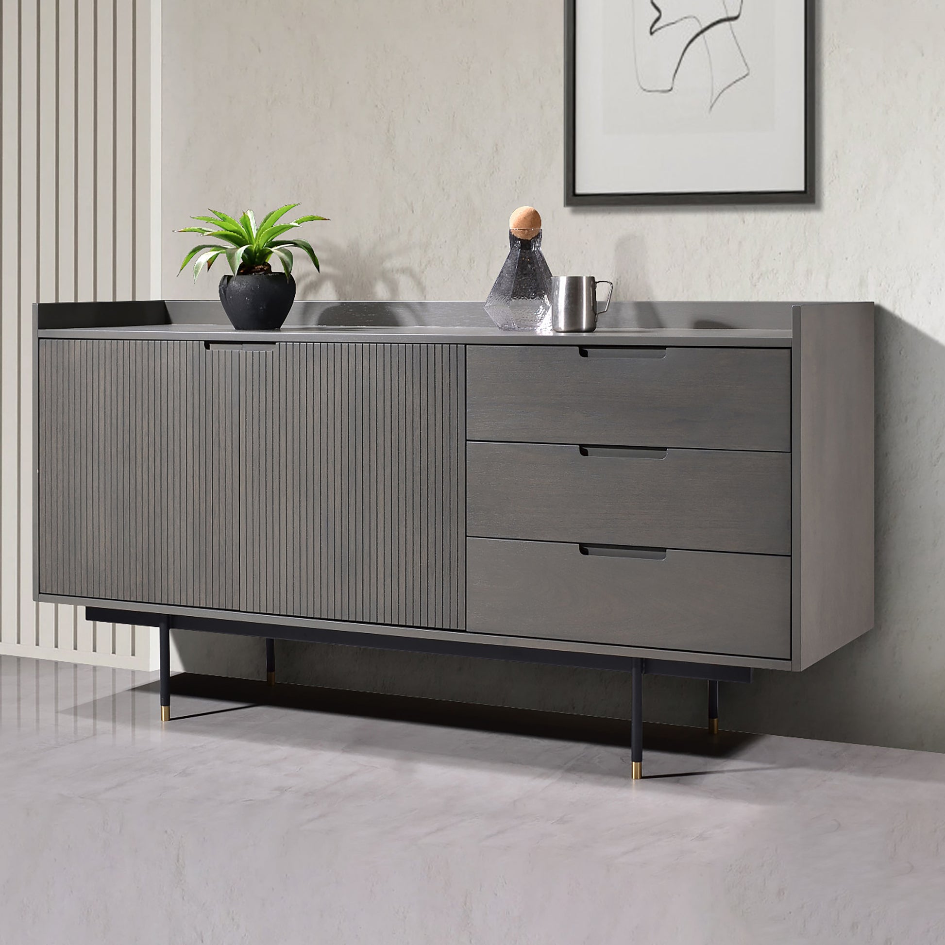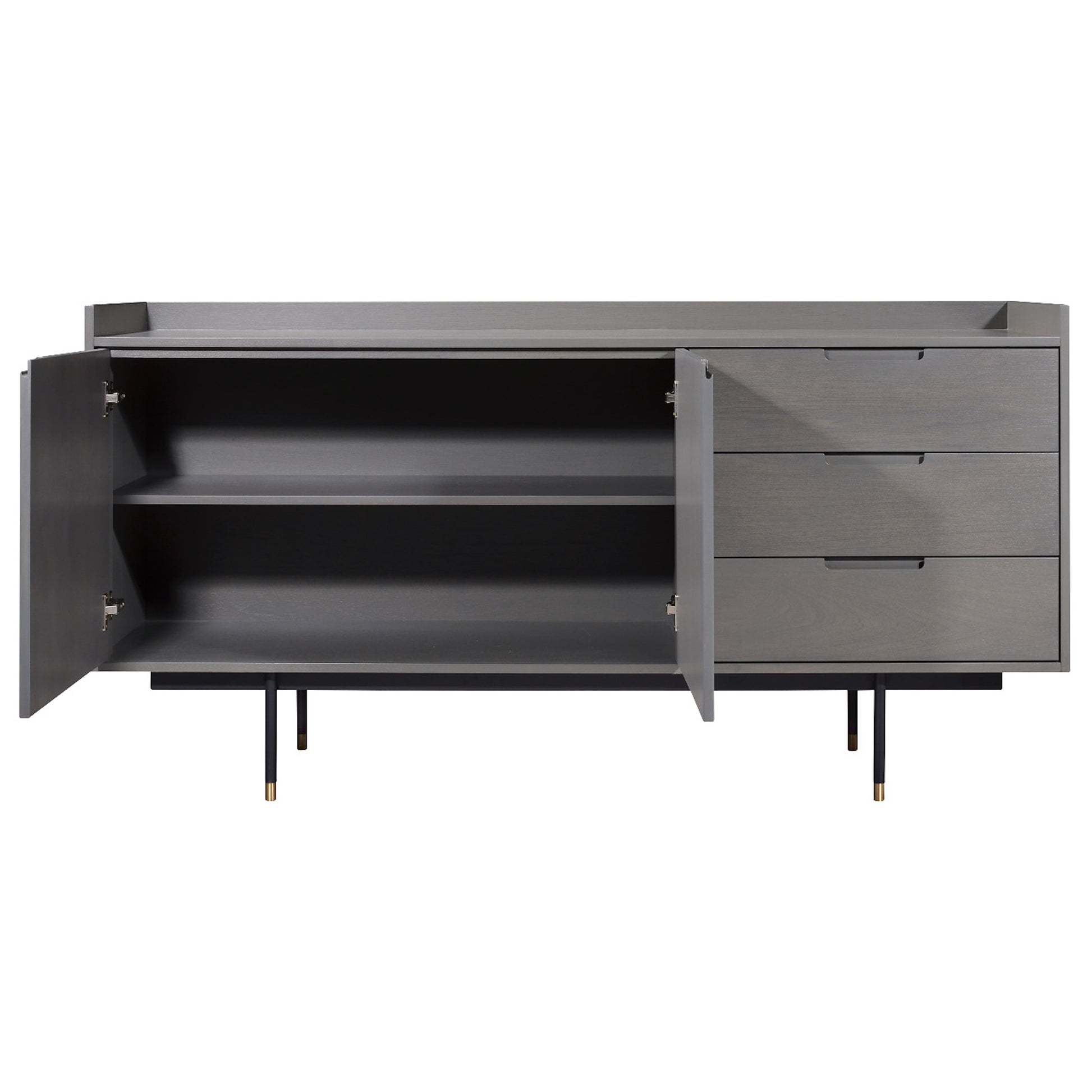 The Criterion Bremer Buffet offers a sleek, stylish storage solution with three drawers and two doors. Finished with a grey KSK wood veneer, powder-coated steel legs, and bronze tips, this quality buffet is built for longevity and sure to last with its 12 month warranty. Enjoy the large table top space for all your decorative pieces and convenience with its semi-assembled design.