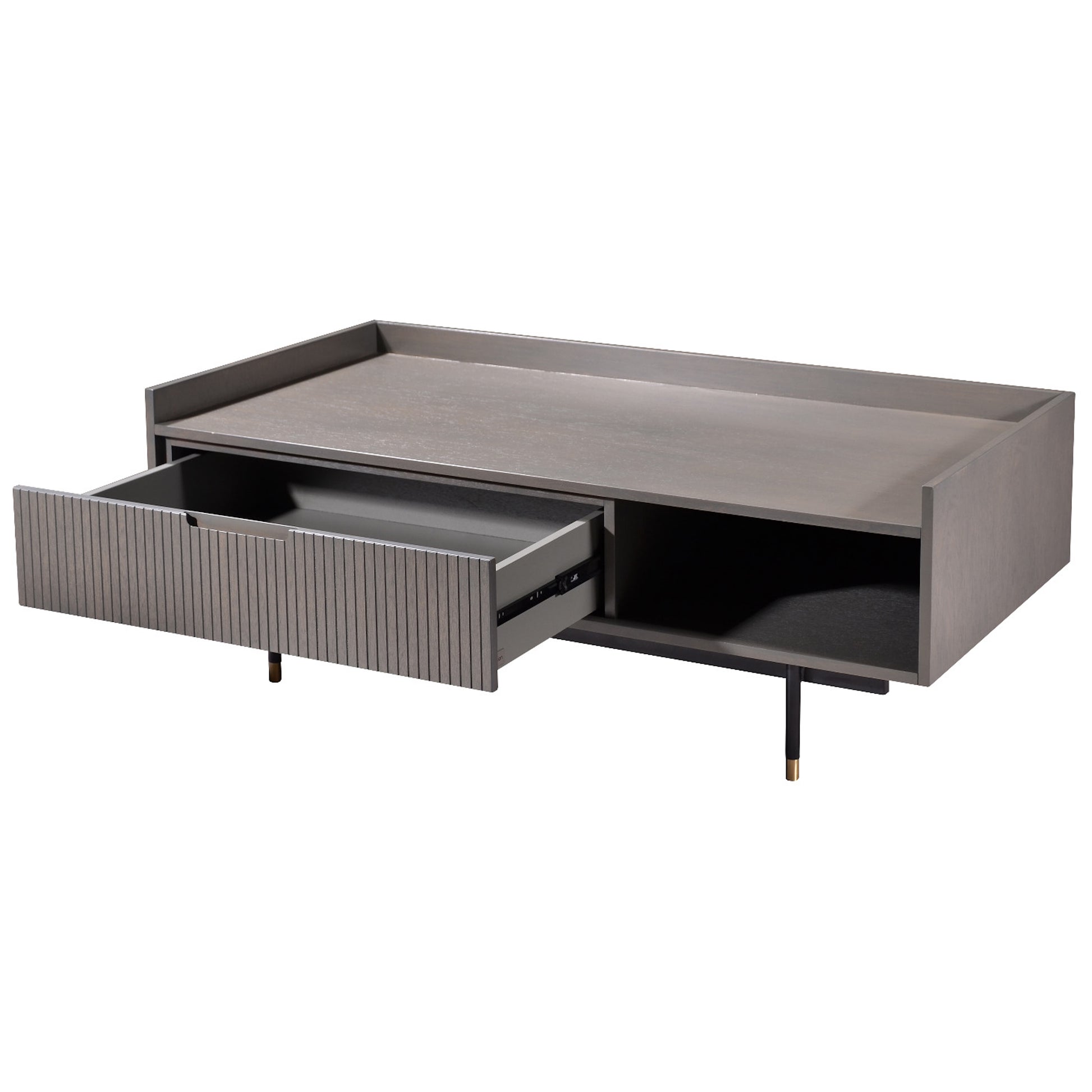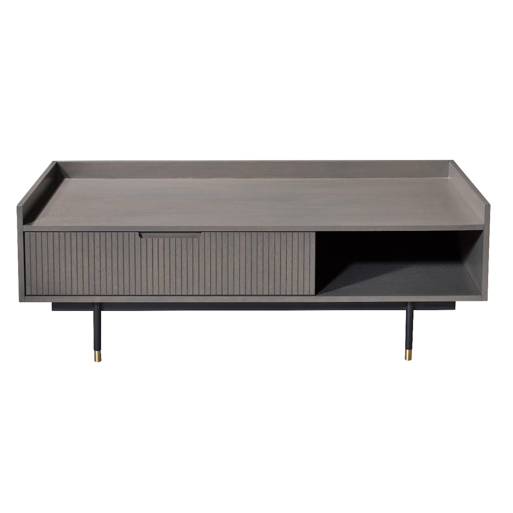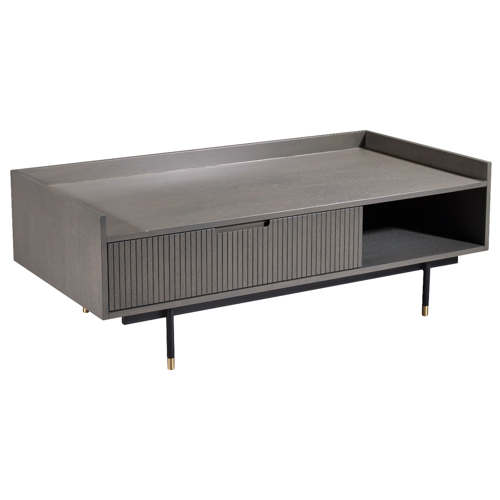 The Criterion Bremer Coffee Table offers a sleek, stylish storage solution with one drawer and one open storage shelf space. Finished with a grey KSK wood veneer, powder-coated steel legs, and bronze tips, this quality Coffee table is built for longevity and sure to last with its 12 month warranty. Enjoy the large table top space for all your coffee needs and convenience with its semi-assembled design.