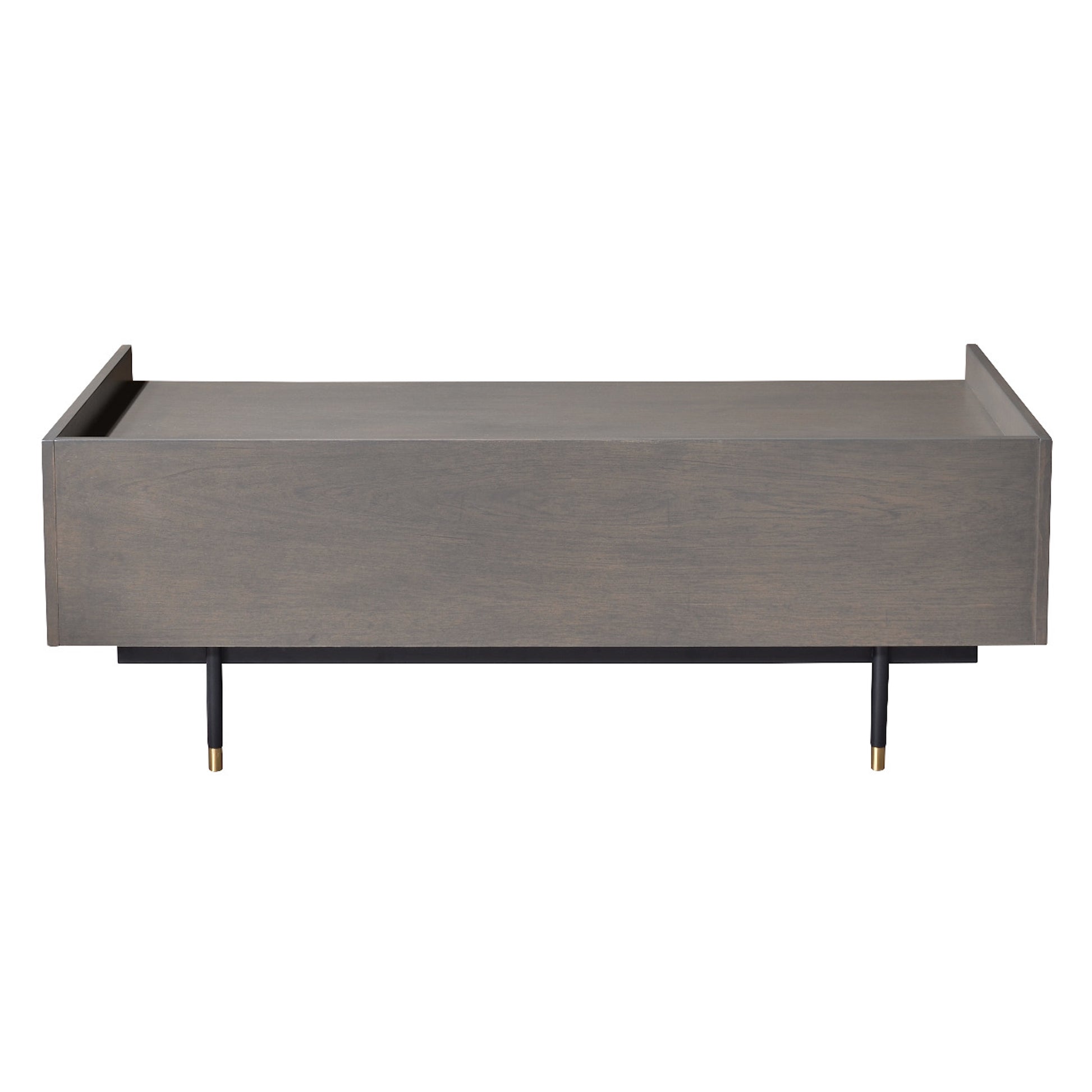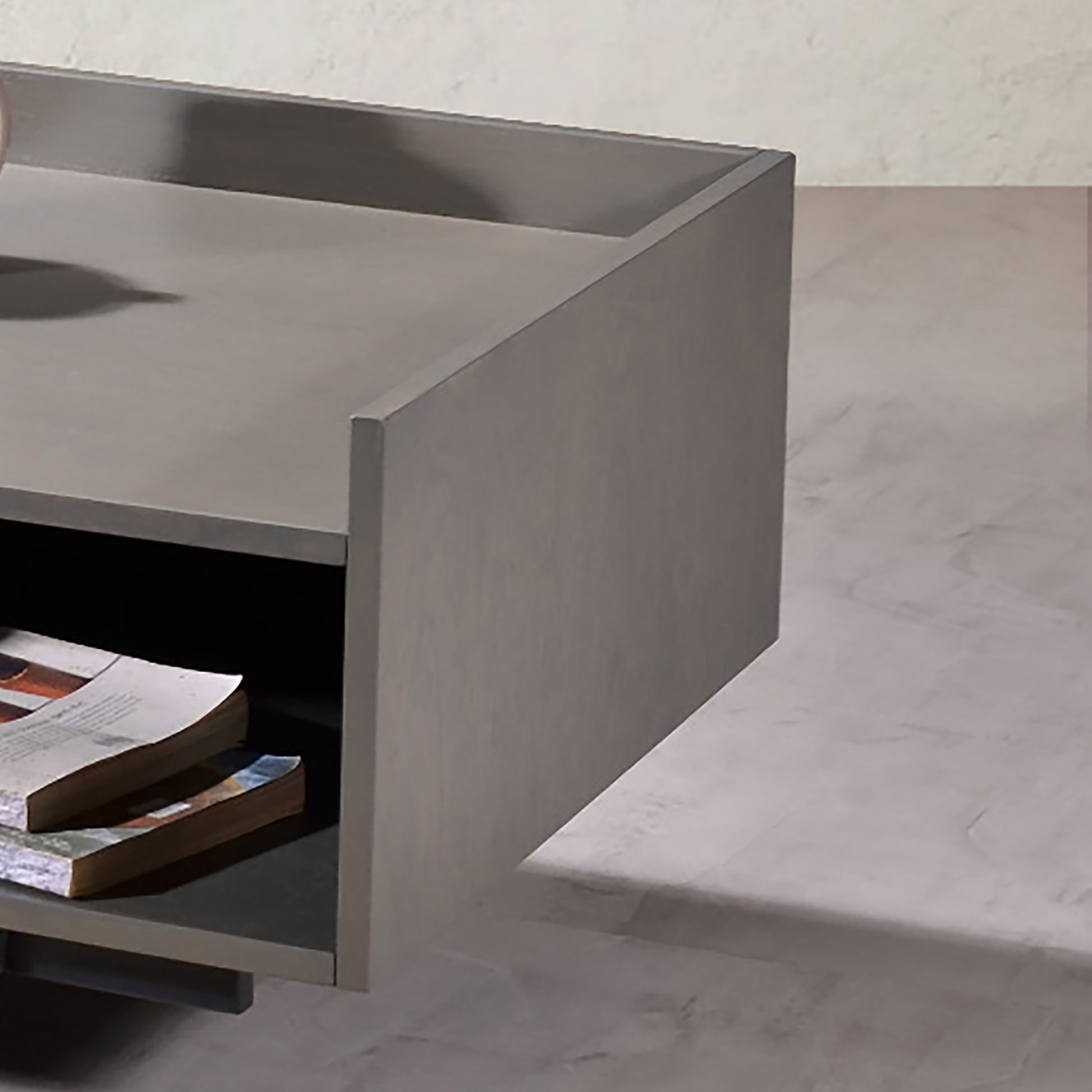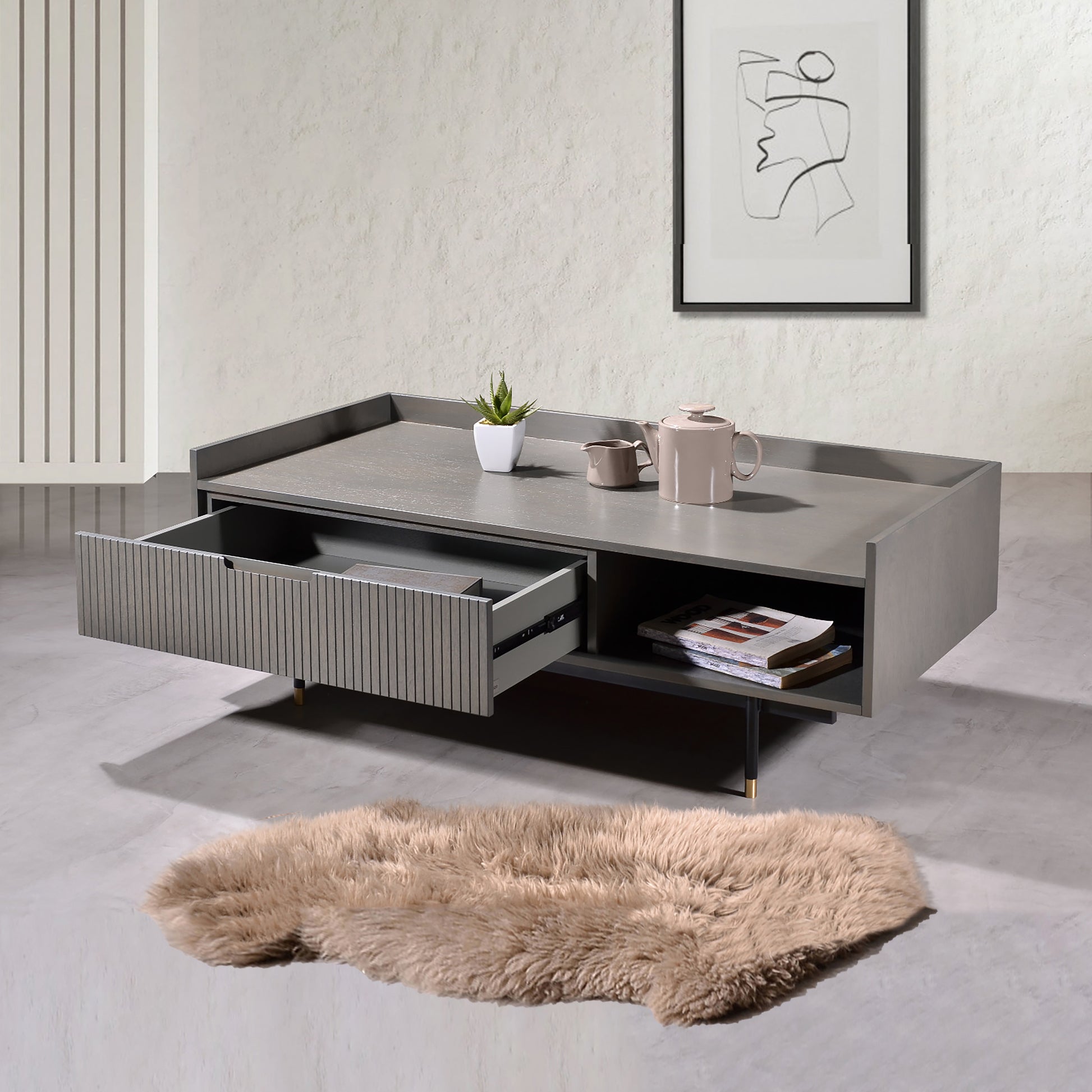 The Criterion Bremer Coffee Table offers a sleek, stylish storage solution with one drawer and one open storage shelf space. Finished with a grey KSK wood veneer, powder-coated steel legs, and bronze tips, this quality Coffee table is built for longevity and sure to last with its 12 month warranty. Enjoy the large table top space for all your coffee needs and convenience with its semi-assembled design.