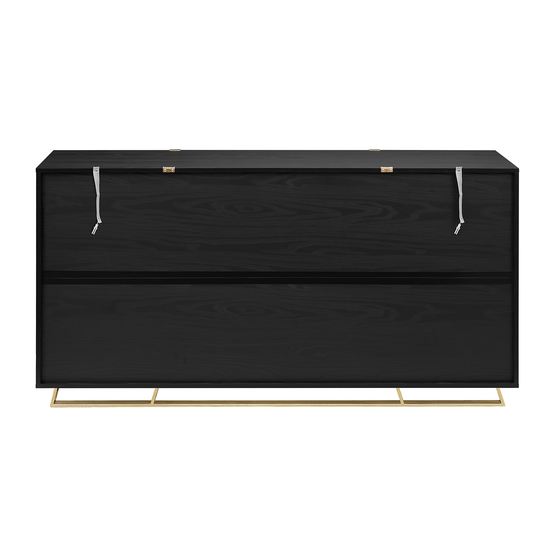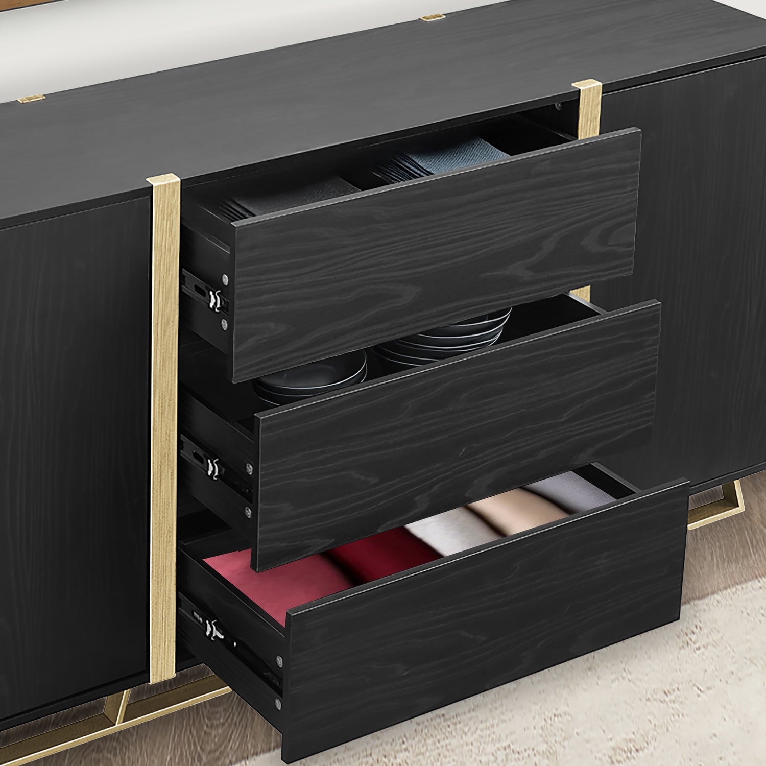 Indulge in the luxurious aesthetics of the Criterion Capri Buffet Unit. This exclusive piece features three black oak drawer fronts with push open functionalities, two doors with internal shelves, and a gold metal base and highlight panels for a touch of elegance. Comes with a 12 month warranty. Elevate your space with this sophisticated side board.