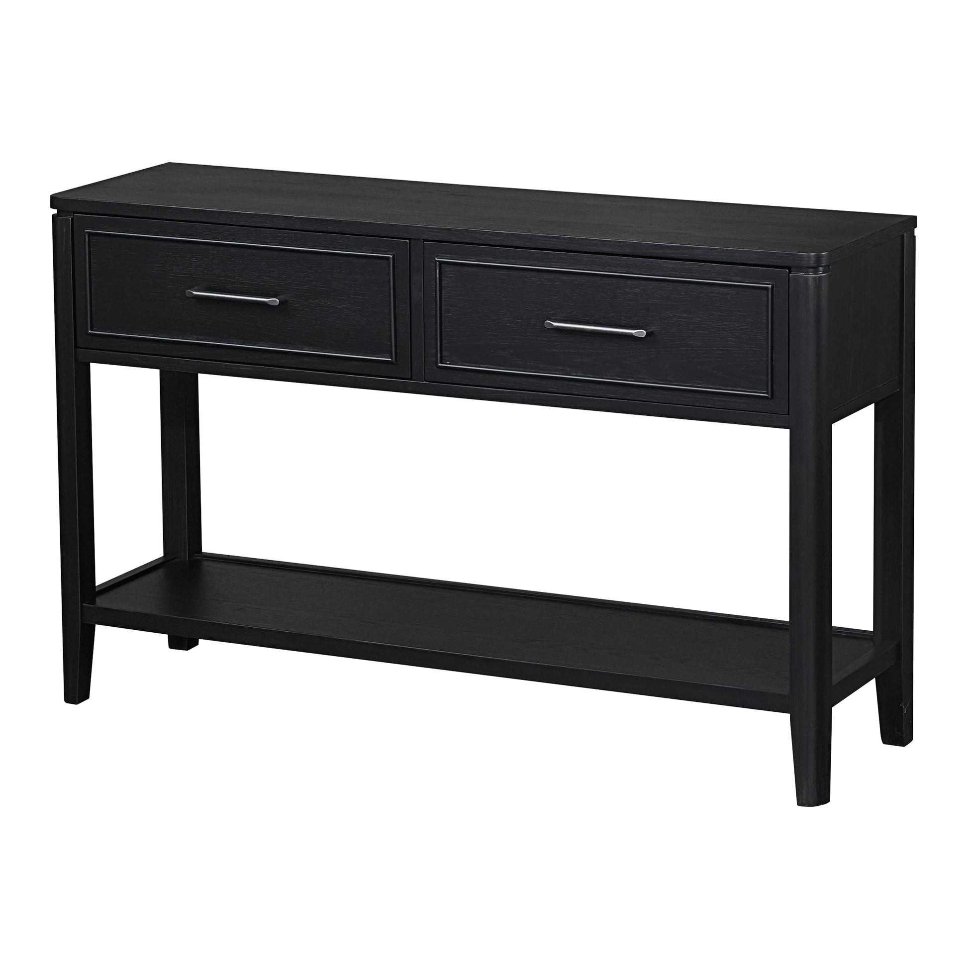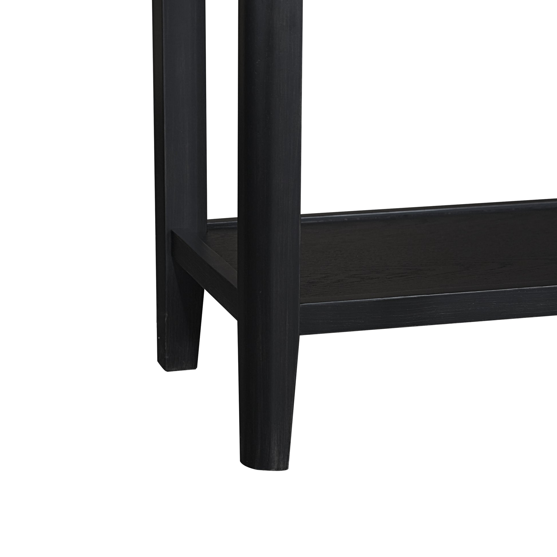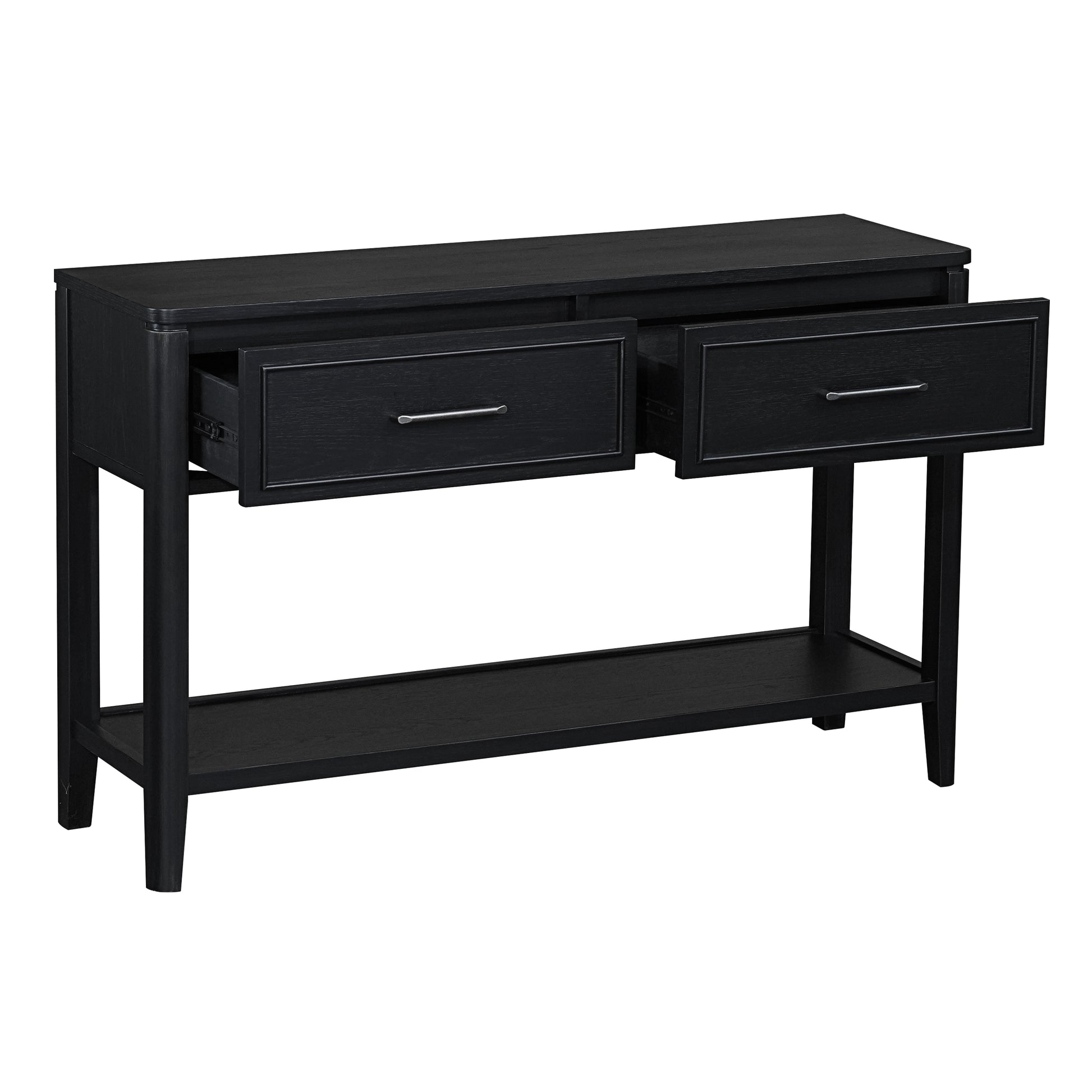 Indulge in luxury with the Criterion Kennedy Console Table. Crafted with real white oak wood veneer and a charcoal stain, this semi-assembled piece exudes sophistication. Solid MDF construction and KD Hevea wood legs offer durability, while two drawers with telescopic runners and a bottom storage shelf provide practicality. Includes an anti-tip kit and a 12-month warranty.