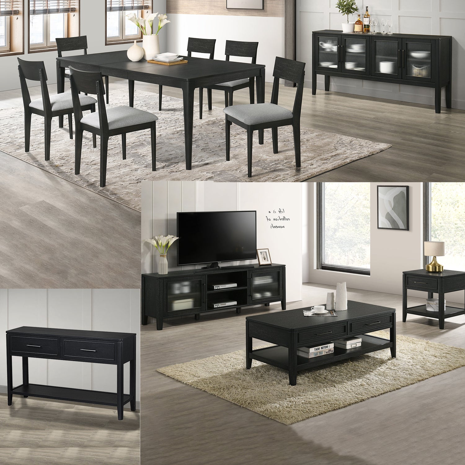 Each stunning piece in the Kennedy Range is manufactured in white oak wood veneer and finished in a modern charcoal stain. The dark charcoal stain enhances the grain’s natural warm texture giving the range a level of sophisticated modern twist from years gone by. The design and colour match will soften the ambiance of your home. The Kennedy range will compliment other furnishings to make your living and dining areas look special and appealing.
