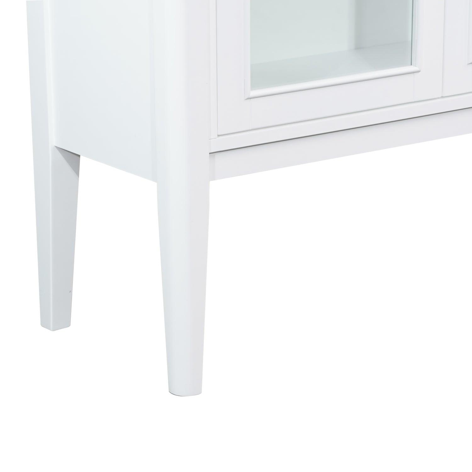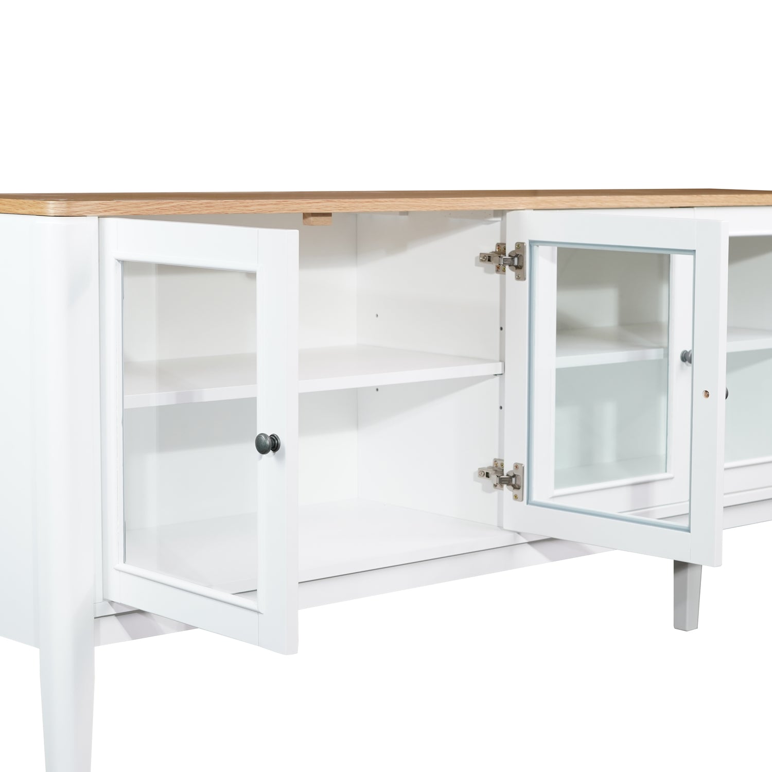 Introducing the Criterion Sorrento Buffet. This luxurious piece features a real white oak veneer and a natural finish top, perfect for any elegant living space. With a white cabinet, solid MDF construction, and KD Hevea wood legs, it exudes sophistication. The four tempered glass doors with metal handles provide a peek into the four internal shelves. Semi-assembled and anti-tip kit supplied. Includes 12 month warranty.